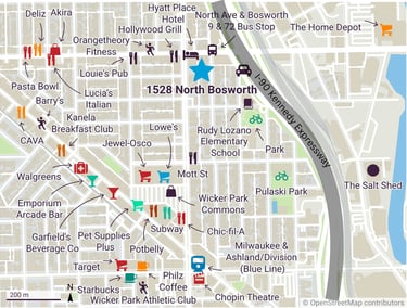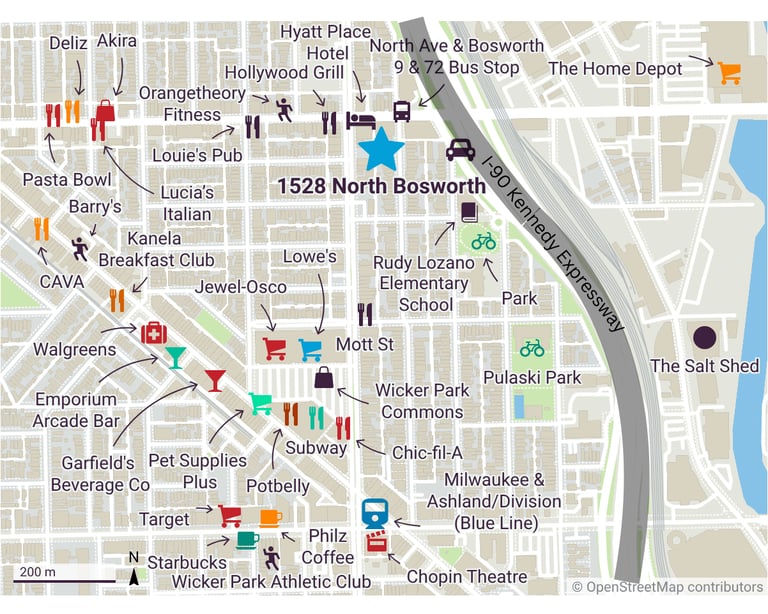 Today, Wicker Park is a popular destination for dining, shopping, and nightlife, attracting both residents and visitors from across the city. Milwaukee Avenue is lined with boutique retailers, coffee shops, and nationally known restaurants, while nearby venues host live music and events year-round. With easy access to the CTA Blue Line and close proximity to downtown, Wicker Park offers a balance of convenience and character that makes it one of Chicago’s most desirable places to live and explore.